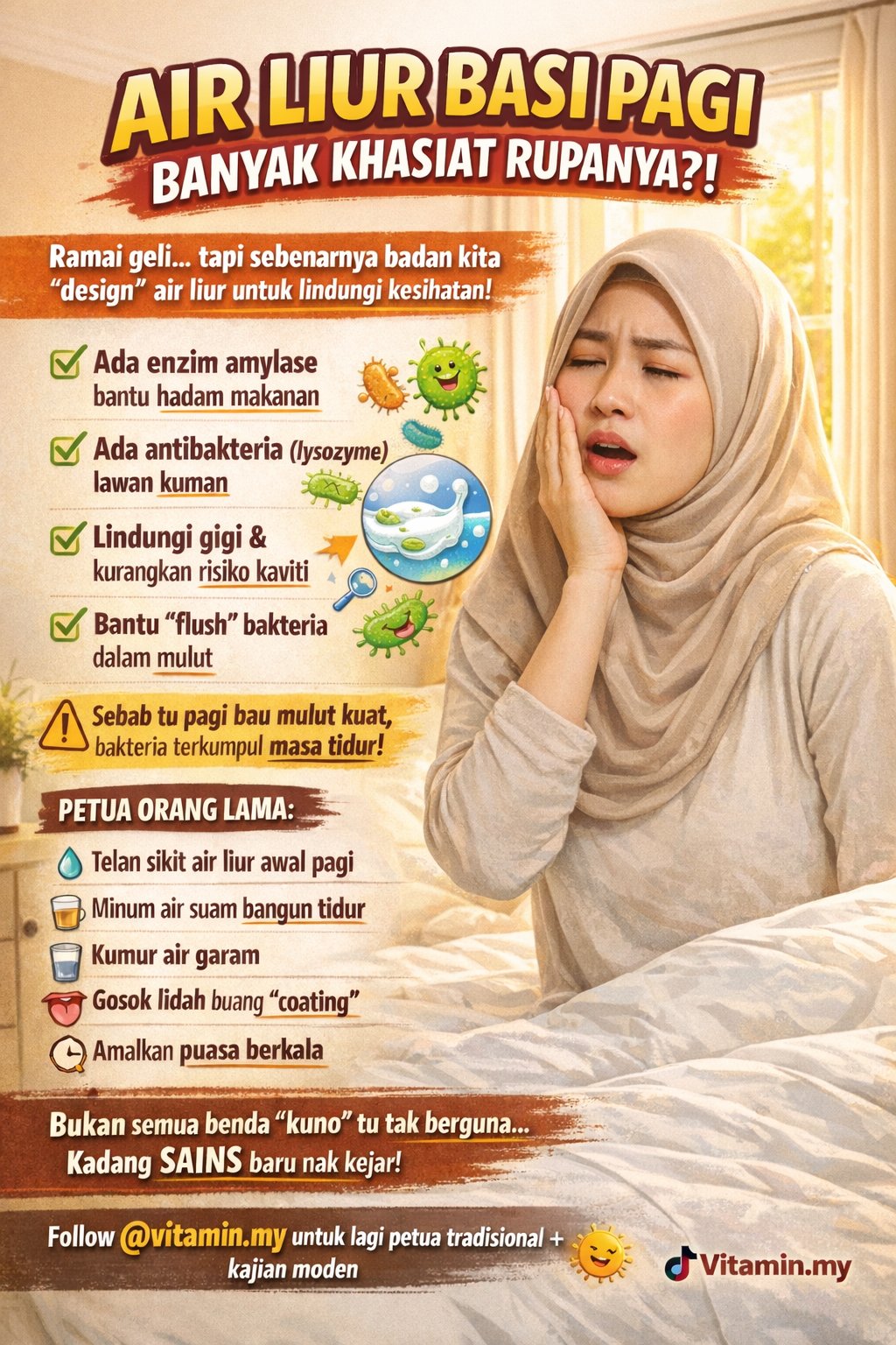 Siapa yang tidak pernah merasai situasi ini? Anda terluka kecil — mungkin tercalar pisau dapur, terjatuh semasa bermain, atau tersangkut duri tanaman — dan ibu atau nenek terus mengarahkan: “Sapu air liur dulu! Air liur pagi-pagi tu mujarab!” Bagi anak kecil, arahan ini kedengaran ganjil, malah agak menjijikkan. Tetapi ternyata, ada logik di sebalik kepercayaan ini yang cukup menarik.