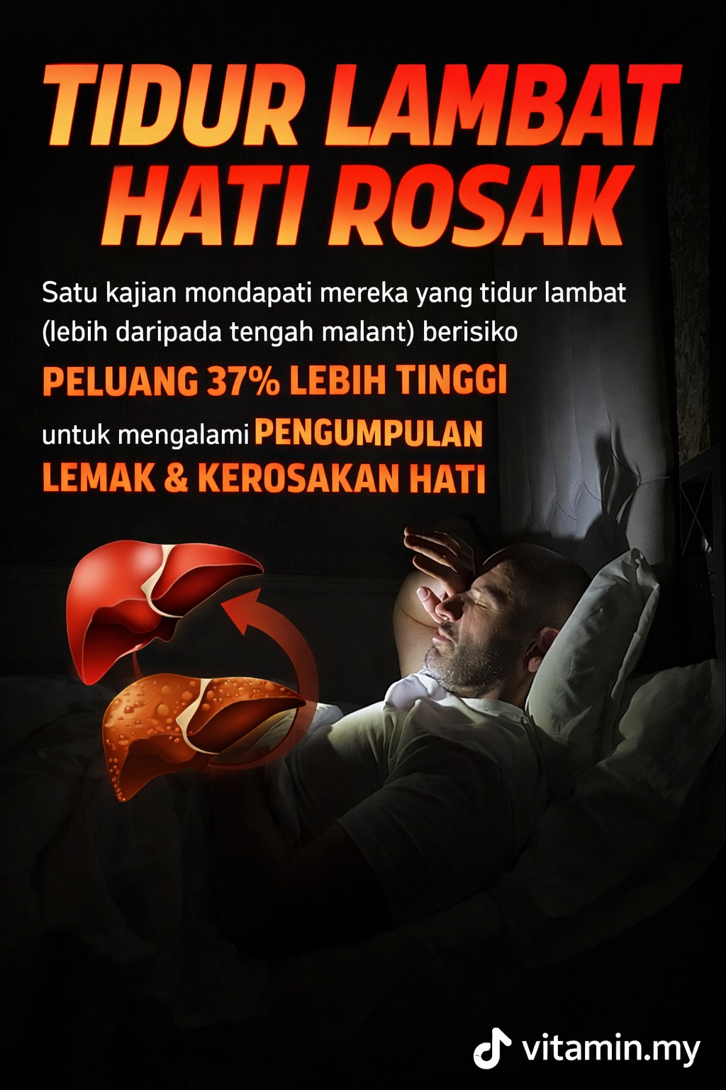 - Penyakit Hati Berlemak Bukan Alkohol (NAFLD):NAFLD adalah keadaan di mana lemak terkumpul secara berlebihan di dalam sel hati, bukan disebabkan oleh pengambilan alkohol. Ia adalah punca utama penyakit hati kronik di seluruh dunia. Satu kajian besar yang diterbitkan dalam Journal of Clinical Endocrinology & Metabolism mendapati bahawa individu yang tidur kurang daripada 6 jam setiap malam atau mempunyai kualiti tidur yang buruk mempunyai risiko yang jauh lebih tinggi untuk menghidap NAFLD. Gangguan ritma sirkadian akibat tidur lewat mengganggu metabolisme lemak di hati, menyebabkan pengumpulan lemak yang tidak normal.